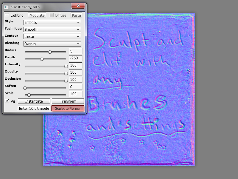 nDo has been released. It's a set of Photoshop actions that allow you to generate normal maps from your images, as well as creating a sculpt layer for you to "sculpt" your normals in Photoshop. There's no realtime preview (a la CrazyBump), but other than that, it's really powerful, and means you can create your maps without leaving Photoshop.